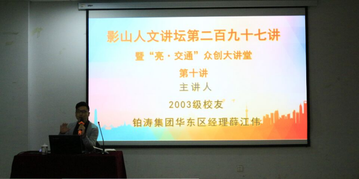 2017年3月22日晚,影山人文讲坛第297讲在体育馆B112隆重开讲。本次特邀2003级校友、铂涛集团华东区经理薛江伟先生做客新学期第一期影山人文讲坛,与同学们就工作、社会、就业等备受关注的各类问题进行了深入、亲切的交流。