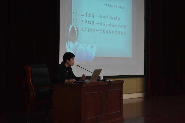 第一部分,张教授以《第二性》为切入点,介绍其作者波伏娃独立辉煌的一生,并对中国古代陋习“三寸金莲”“三从四德”“七岁不同席”进行有力抨击,从而告诫当代女性当自尊。