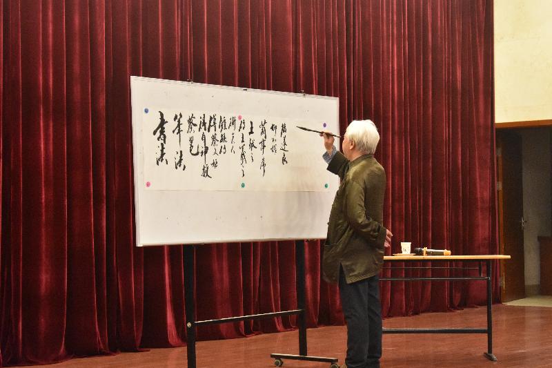 本次讲座,朱教授从“书画文化的理论讲解”和“现场书法演示”两个层次展开。首先朱教授介绍了中国书法文字与中华民族文化的渊源及发展历程,并列举汉代蔡邕及女儿蔡文姬的历史典故,进而引用毕加索名言“假如生活在中国,我一定是个书法家,而不是画家”深入浅出地道出了中国书法艺术的重要性。
