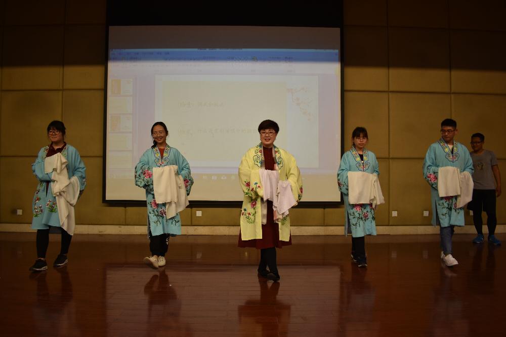 在讲座中场,段教授邀请同学们上台亲自教授京剧动作,使同学们感受了一回京剧的魅力。段教授教授完毕之后,对上台的同学们进行了采访,同学们一一讲述了自己对国粹京剧的见解与感受。