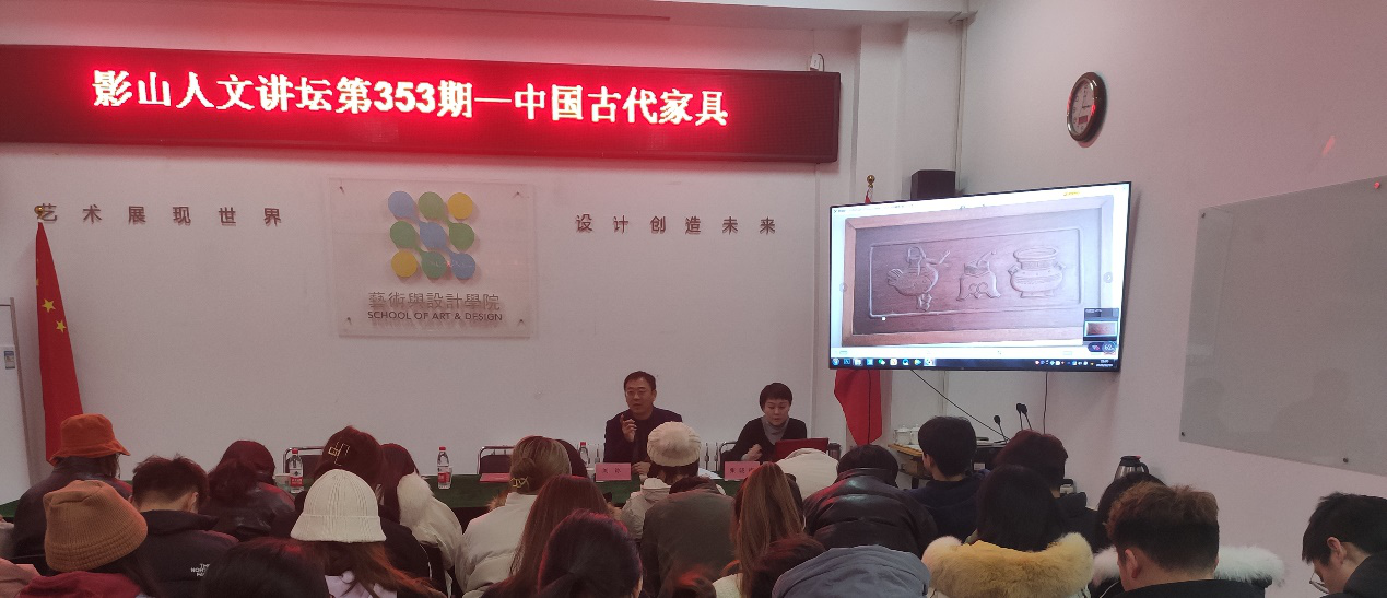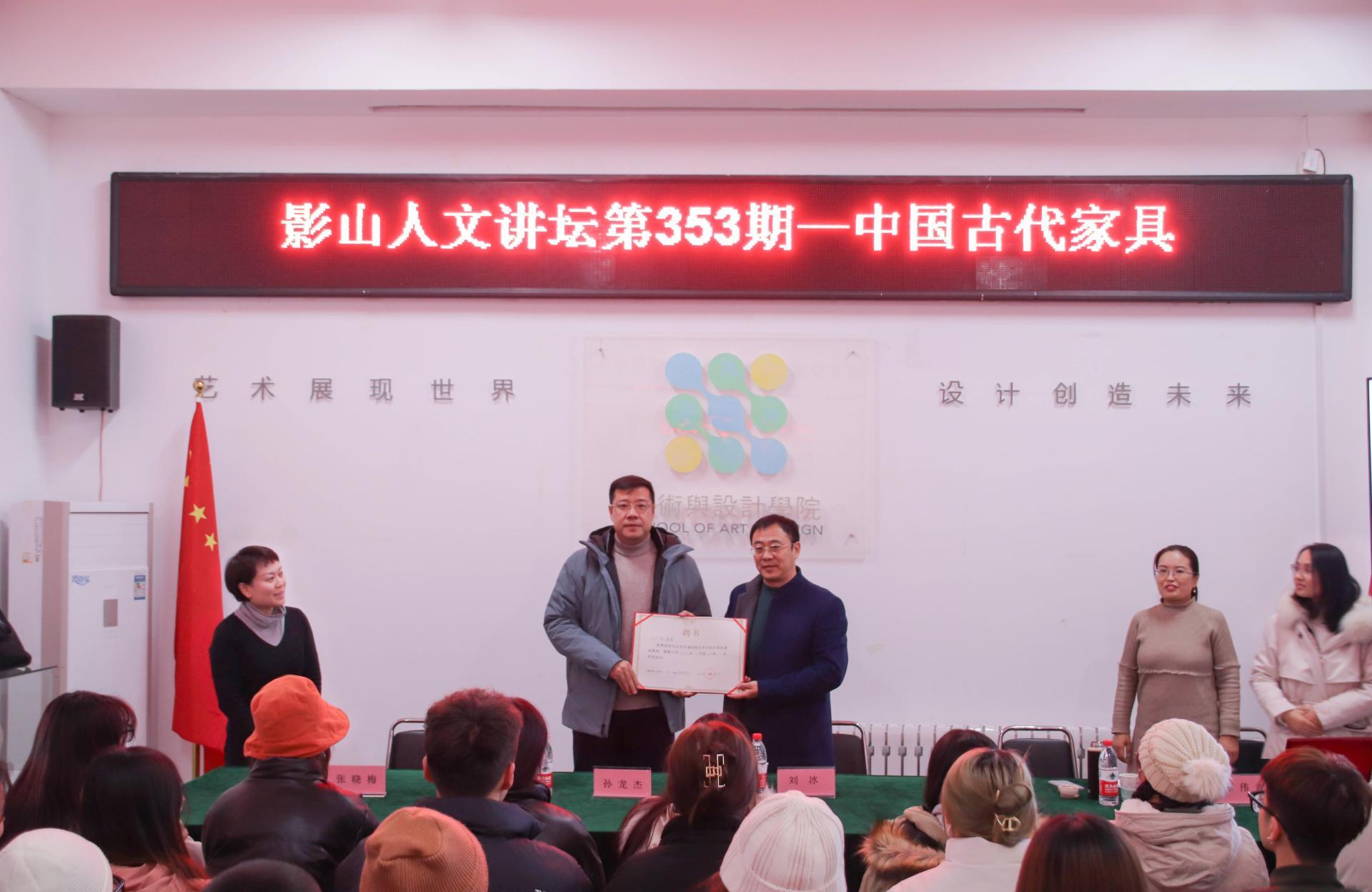 2020年12月16日下午,由艺术与设计学院主办,校团委承办的影山人文讲坛第353期在长清校区工程训练中心A308举行。本次讲座有幸邀请到了中国文物学会会员,山东省收藏家协会会员,济南收藏家协会副理事长,杂项专家刘冰教授做客影山人文讲坛,为同学们带来了一场以“中国古代家具”为主题的精彩讲座。出席本次讲座的学校领导和老师有:艺术与设计学院院长孙龙杰,张晓梅老师,艺术与设计学院团总支书记陈伟青老师。艺术与设计学院20级代表参加了此次讲座。